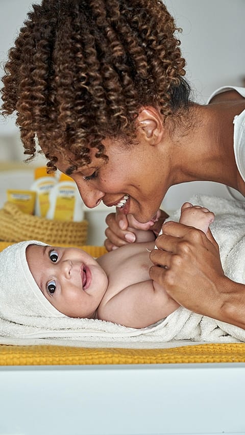 Rovnako ako pri mnohých iných každodenných činnostiach je aj pri starostlivosti o pokožku dôležité, aby ste svojmu dieťatku priebežne oznamovali, čo sa chystáte urobiť. Deti dokážu porozumieť mnohým veciam ešte predtým, než začnú hovoriť. Tým, že ich priamo oslovíte a oznámite im, čo práve robíte, im ukazujete svoj rešpekt a dôveru v ich schopnosti.