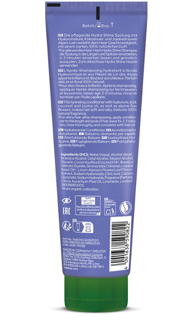 Kondicionér Hydra Shine od Weledy dodáva vlasom hebkosť a rozmaznáva ich 100 % prírodnou vôňou.