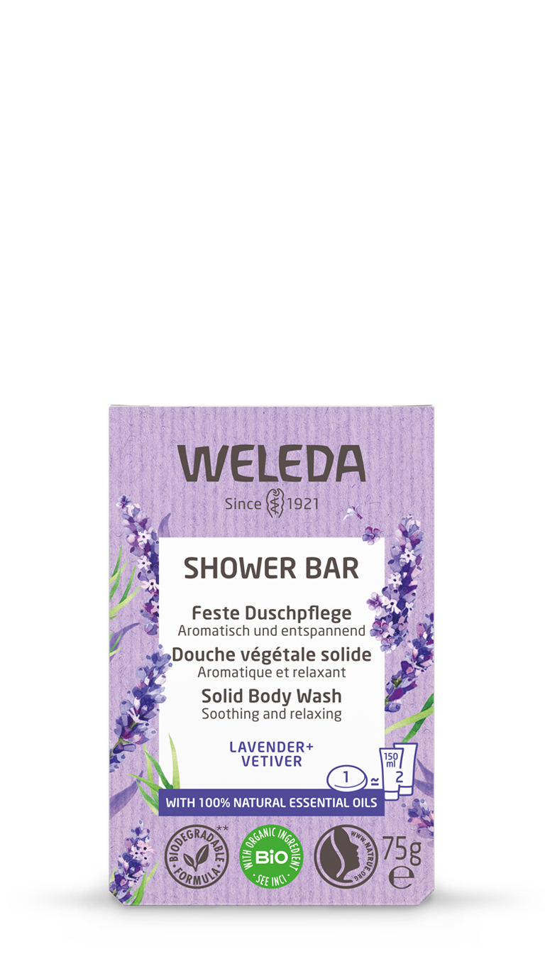 Starajte sa o svoju pokožku, rozmaznávajte zmysly a minimalizujte množstvo plastového odpadu. Uvoľnite sa a relaxujte s našou upokojujúcou zmesou aromatickej levandule a drevitého vetiveru. Vôňa tvorená 100 % prírodnými esenciálnymi olejmi sa vďaka horúcej pare rozvinie, aby vám priniesla jedinečný harmonizujúci zážitok. Biologicky odbúrateľná receptúra 100 % prírodného pôvodu sa stará o vašu pokožku a zanecháva ju čistú a navoňanú. Krémová pena obohatená o organické bambucké maslo a rastlinný glycerín bude vašu kožu rozmaznávať a dôkladne čistiť - všetky benefity, na ktoré ste vo Welede zvyknutí, teraz získate v tuhej podobe! Pena sa ľahko oplachuje - môžete tak počas sprchovania vypnúť vodu a trocha jej tým ušetriť! Jedno mydlo vydrží približne tak dlho, ako dve 150 ml balenia sprchovacích krémov od Weledy. Balené je do papiera, ktorý obsahuje minimálne 55 % recyklované materiály a možno ho ľahko znova recyklovať. Čistá tak bude nielen vaša pokožka, ale aj svedomie.